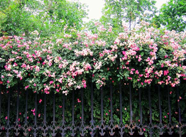 薔薇,帶刺的薔薇藤蔓攀爬在鐵柵欄間,可以形成綠色的“生態(tài)圍墻”,薔薇花開的季節(jié),一整片的花朵鋪設(shè)在圍墻上,美不勝收,它還具有防盜、易管理等優(yōu)點;
