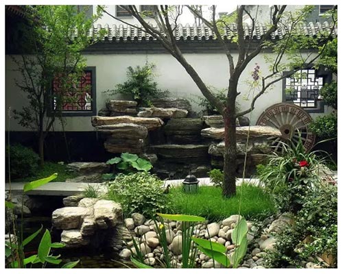 庭院設(shè)計(jì)的如在庭園內(nèi)的地面上設(shè)置相應(yīng)的景物,如景石、水池、花壇、雕塑、園燈等,作為庭景的中心卞題;或者通過景窗、景門、敞廓等將墻外的自然景色(如樹梢、遠(yuǎn)山、天空等)引入墻內(nèi),借以豐富庭園空間的層次,增添庭院景觀的自然氣氛以山石環(huán)境和建筑物圍閉沿墻構(gòu)廓、高低起伏、曲折空靈,是傳統(tǒng)的”化實(shí)為虛”的手法。