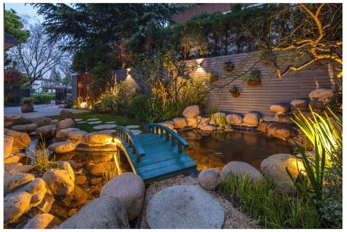 往前走,就看到黃銹石汀步搭配青青草坪,在鏡頭下顯得異??蓯邸J^堆砌出的假山水景支上的藍色小橋,個性又增添顏值。