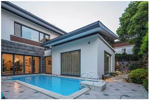 落地窗邊的水池是緊貼著墻面的,這次水池設(shè)計是一大亮點。白色建筑搭配藍色泳池,清爽大氣。與之搭配天藍色爬藤架,提升了整個空間的格調(diào)。