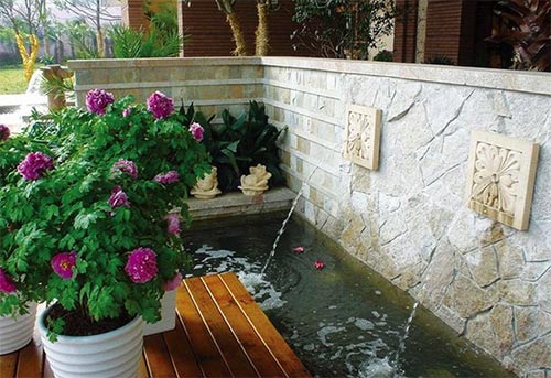 在庭院局部墻壁上安裝魚、蛙、龍、獸甚至人面的吐水雕塑小品,引水管置其口中,作細(xì)流吐水,就成了壁泉?;?qū)⑺空{(diào)節(jié)到很小,使水?dāng)鄶嗬m(xù)續(xù)地滴下,在庭院中形成“滴答”、“叮咚”的聲響效果。如,在樓梯兩側(cè)砌有石縫的平整墻面上,水從縫隙中緩緩流出,形成優(yōu)雅自然的美景。成功的壁泉設(shè)計(jì)能將大自然的神韻與氣質(zhì)帶進(jìn)密集、封閉的住宅庭院中來。